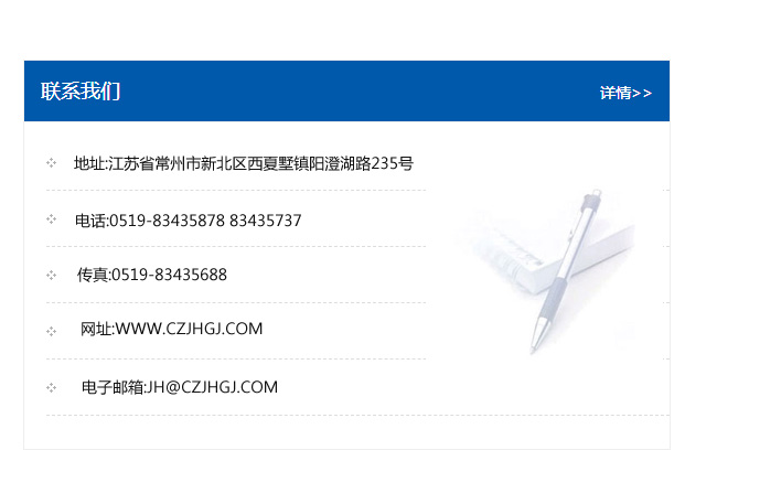 地址:常州市新北區友邦商務大廈1幢16、17層  電話:0519-85101652  傳真:0519-85112595  郵編:213022  網址:www_cz-jiayue_cn.cpdaxue.com  郵箱:xiajifengaa@163.com